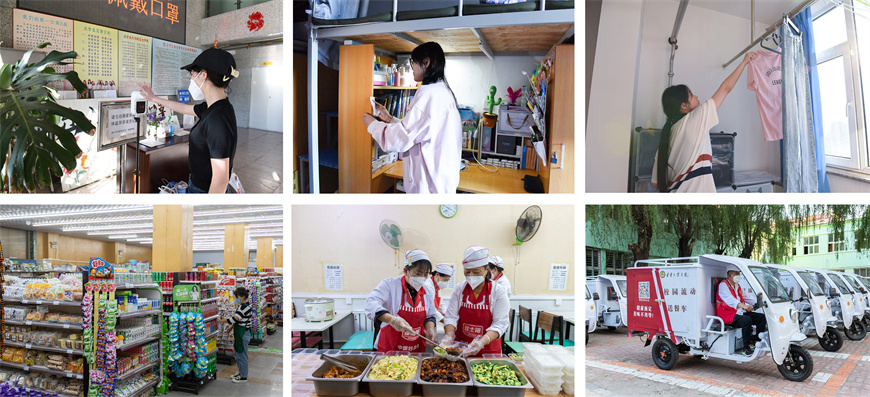 学校为返校学生设立运送行李车队,入校后直接将行李放在“专车”上,一路护送到宿舍楼下,感受“稳稳的幸福”。超市里,琳琅满目的商品已经整齐地摆放在货架上,等待同学们选购。食堂中,阿姨们将热腾腾的饭菜准备妥当,细心打包送到宿舍楼下,同学们可以品尝思念已久的辽工大味道。刚刚返校的同学们也在宿舍中奋力打扫,打造干净、整洁的休息和学习环境。