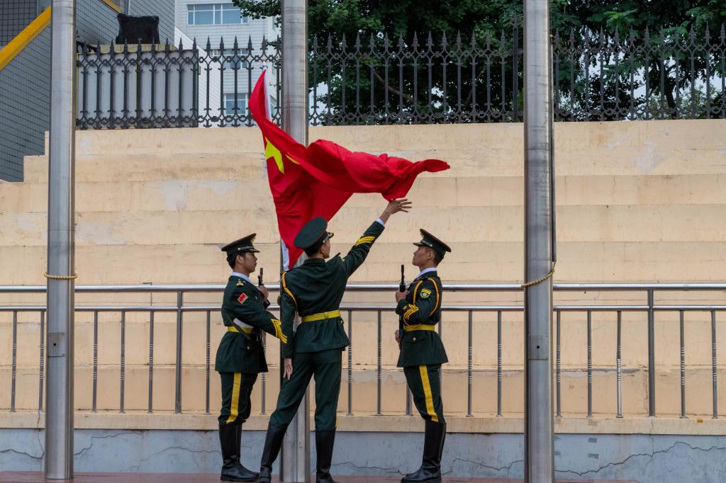 早7时整,学校国旗护卫队队列整齐、步伐坚定,护卫着国旗步入升旗台。伴随着雄壮激昂的《义勇军进行曲》,鲜艳的五星红旗冉冉升起。全体师生庄严肃立,齐唱国歌,向国旗行注目礼。