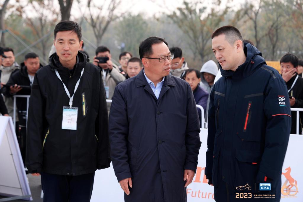 赛事的最后一日,校党委副书记、校长王琦亲临比赛现场,为队员们送上关心与鼓励。电车耐久赛完成后,他与队员共同庆祝这激动人心的时刻。他希望队员们在比赛过程中积累经验,与优势车队加强交流学习,相互借鉴。无人车高速循迹比赛中,王琦在场外时刻关注着赛车情况,并与蔚来汽车创始人李斌董事长在校企人才联合培养、新能源与智能网联汽车技术等方面进行了深入交流。