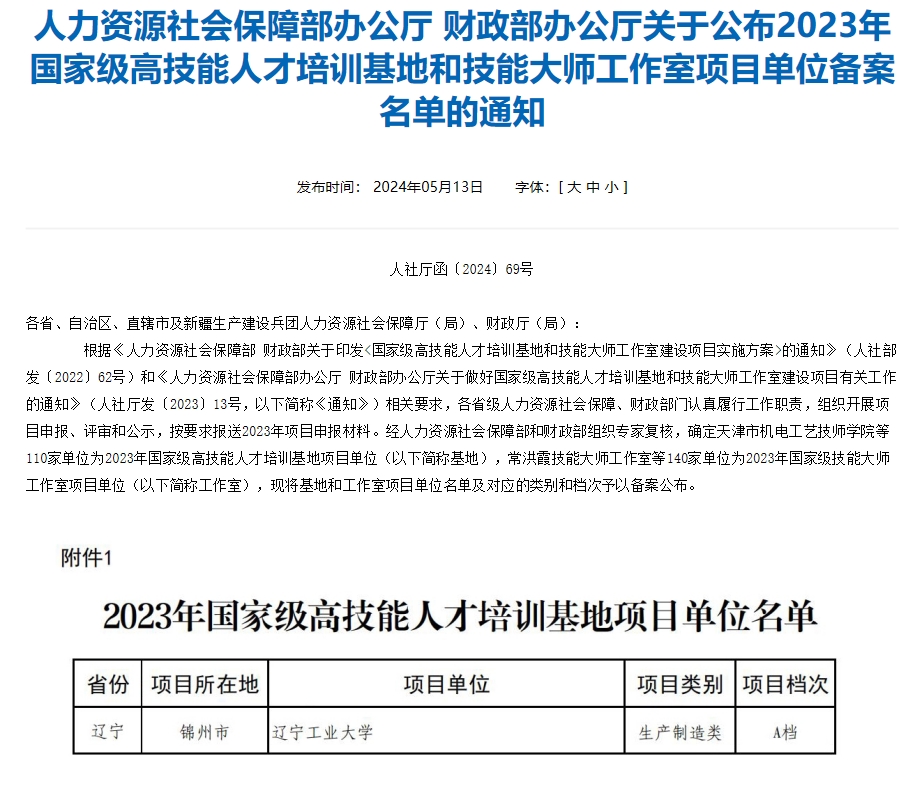 近日,国家人力资源社会保障部办公厅、财政部办公厅公布2023年国家级高技能人才培训基地和技能大师工作室项目单位备案名单,best365成功获批国家级高技能人才培训基地项目单位,机械制造基础加工、工业机器人操作系统、化学原料和化学制品制造三个培训项目获批生产制造类A档项目。