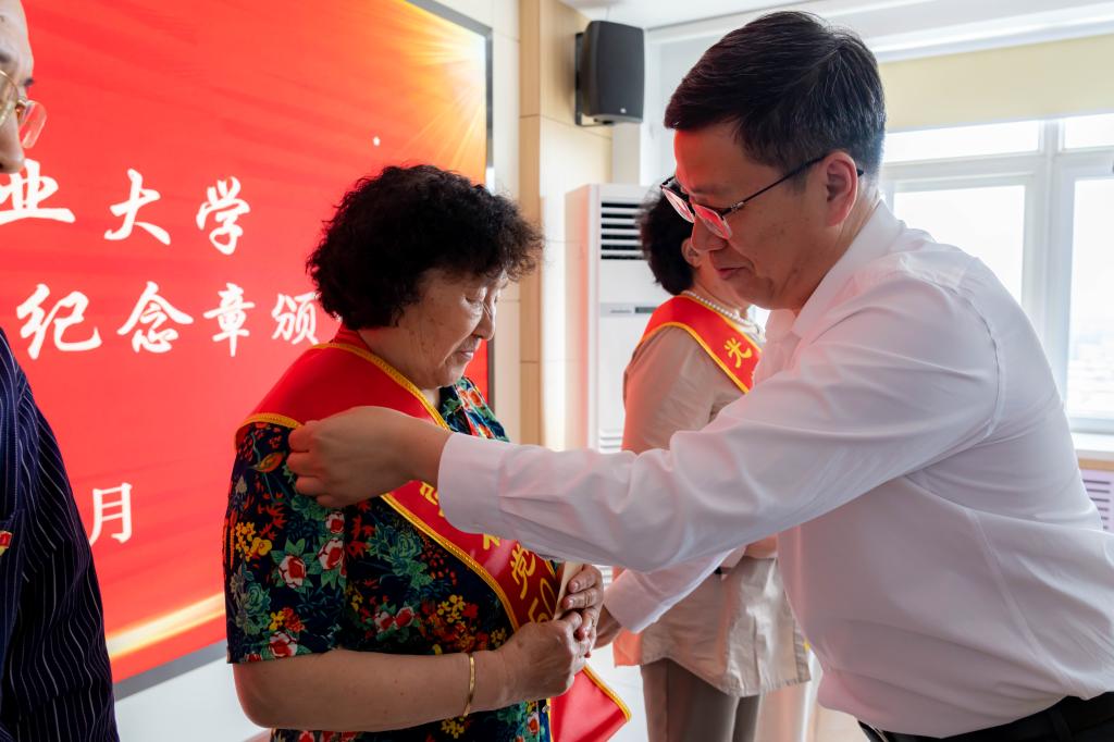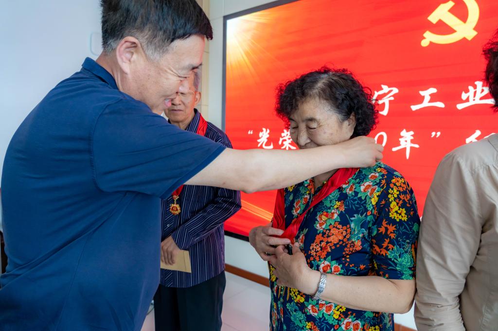 钱英伟和张广安共同为获得纪念章的老党员代表佩戴绶带,颁发纪念章并送上鲜花,向老党员们致以亲切的问候和崇高的敬意。