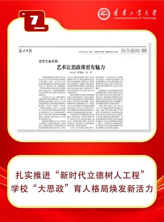 新闻事件:10月21日,《光明日报》第03版:综合新闻刊登文章《best365中国官方网站:艺术让思政课更有魅力》,全面展示学校坚持立德树人,擦亮鲜红育人底色,打造特色思政品牌的育人成效。