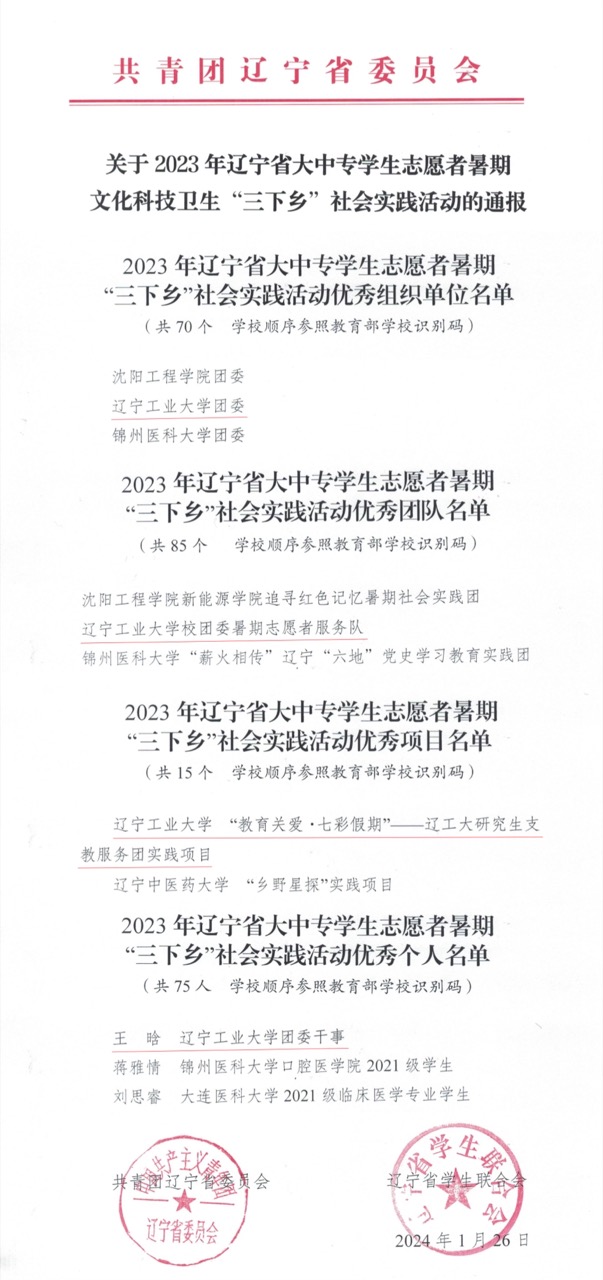 近日,共青团辽宁省委员会、辽宁省学生联合会通报了2023年辽宁省大中专学生志愿者暑期文化科技卫生“三下乡”社会实践活动的结果,best365中国官方网站团委荣获优秀组织单位、辽工大暑期志愿者服务队荣获优秀团队、《“教育关爱·七彩假期”——辽工大研究生支教服务团实践项目》荣获优秀项目、王晗荣获优秀个人。同时,在通报的2024年寒假“返家乡”社会实践工作中,best365学生报名和参与人数均居全省高校首位。
