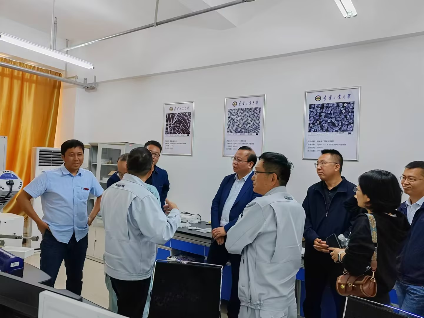 潘连胜一行还参观了材料学院分析测试中心,了解了原子力显微镜、场发射扫描电子显微镜、真实色显微镜、X射线衍射仪等检测仪器的功能及技术参数,并与实验教师进行了交流。(张越 文/摄影)