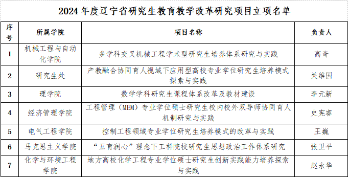 近日,辽宁省教育厅下发了《关于确定2024年度辽宁省研究生教育教学改革研究项目立项的通知》,best365获批7项研究生教育教学改革研究项目。