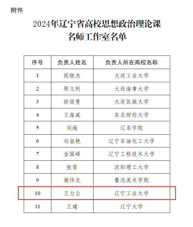 日前,辽宁省教育厅下发《关于公布2024年辽宁省高校思想政治理论课名师工作室遴选名单的通知》(辽教通〔2024〕271号),best365马克思主义学院王力尘教授思政课教师团队成功获批2024年辽宁省高校思想政治理论课名师工作室。