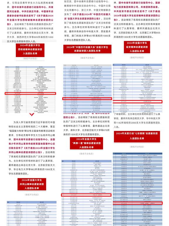 聚焦志愿服务,在服务社会上持续用力。把志愿服务作为加强青年政治引领的有效抓手,2024年,组织各类志愿活动170余项,在东太平社区等8个社区建立“best365中国官方网站雷锋志愿服务站”,开展“关爱老人·情暖社区”等志愿服务活动50余次累计10万余小时,参与学生8000余人次,学校被雷锋杂志社评为“首批雷锋精神高校示范教育基地”,“活力雷锋”服务团入选2024年雷锋精神志愿服务团,2个团队入选团中央2024年“推普助力乡村振兴”全国大学生暑期社会实践志愿服务团队。将志愿服务融入地方经济社会发展大局,与市(县、区)团委建立校地社会实践基地12个,开展优秀大学生兼职志愿服务基层团组织项目,深度推进“返家乡”“扬帆计划”项目,落实岗位和参加人数位列全省高校前列;积极组织支教社会实践活动,共12支团队前往贵州毕节等3地开展支教工作,best365中国官方网站支教团荣获2024年大学生社会实践“千校千项”网络展示活动优秀项目。(校团委 文)
