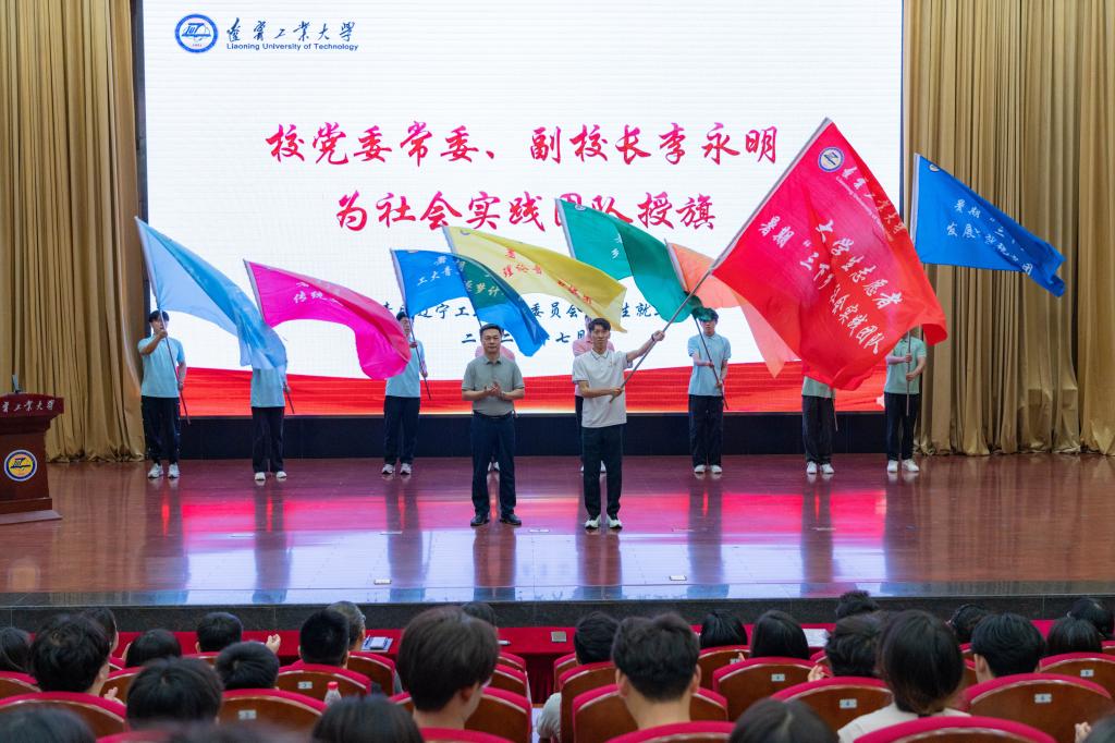 李永明为即将出征的社会实践团队授旗,并对他们提出三点希望:一是以“躬身”的姿态,用所学知识服务社会,书写社会实践的“家国情怀”。二是以“专业”的本领,将职业发展与就业探索融合,点亮职业生涯的“启明灯塔”。三是以“传承”的自觉,赓续建立在辽沈战役配水池战斗遗址上大学的红色血脉,讲好新时代辽工大的“青春故事”。