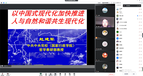 11月2日下午,马克思主义学院邀请中央党校(国家行政学院)哲学部二级教授、博士生导师赵建军作了题为《以中国式现代化加快推进人与自然和谐共生现代化》的专题学术报告。学院领导班子、硕士生导师、思政课教师、全体硕士研究生、省内外部分思政课教师共计200余人共同线上聆听了本次报告。报告会由院长艾志强教授主持。
