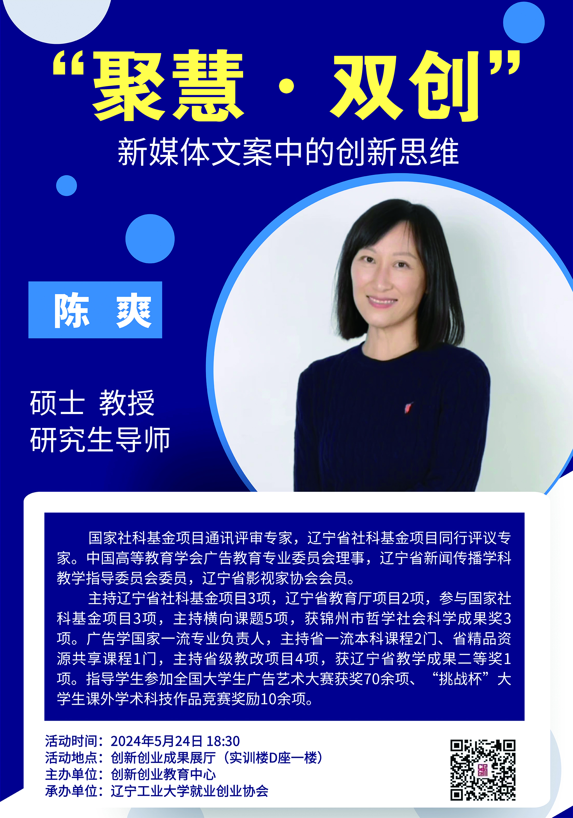 陈爽,硕士,教授,文化传媒与艺术设计学院院长,研究生导师。国家社科基金项目通讯评审专家,辽宁省社科基金项目同行评议专家。中国高等教育学会广告教育专业委员会理事,辽宁省新闻传播学科教学指导委员会委员,辽宁省影视家协会会员。