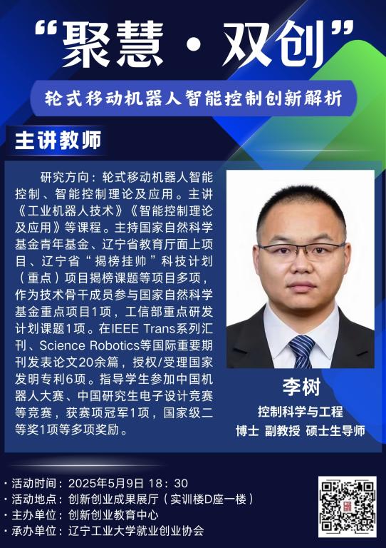 李树,工学博士,副教授,硕士生导师。研究方向:轮式移动机器人智能控制、智能控制理论及应用。主讲《工业机器人技术》《智能控制理论及应用》等课程。